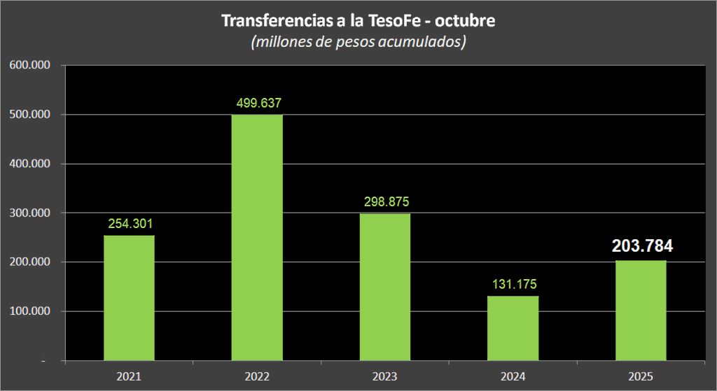 La recaudación en 2025 es la segunda más baja de los últimos cinco años, apenas por encima de 2024. En octubre, el monto acumulado transferido a la Tesorería de la Federación (TesoFe) alcanzó los 203 mil 784 mmdp, 55 por ciento por arriba de los 131 mil 175 millones del mismo mes del año previo.