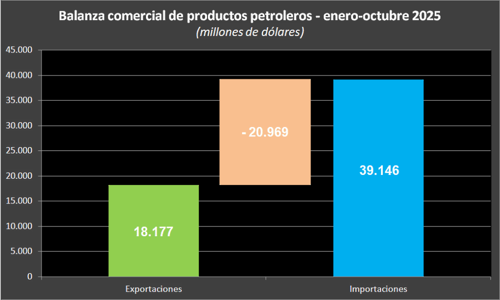 La balanza comercial de productos petroleros entre enero y octubre de este año registró un déficit de 20 mil 969 millones de dólares (mmdd).
