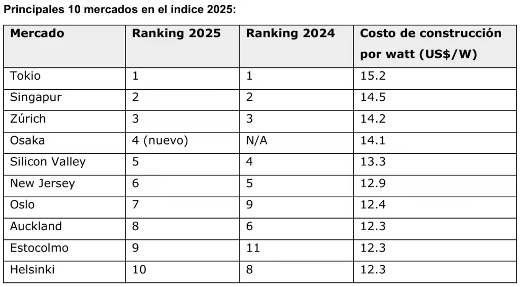 Además de la encuesta, el índice compara costos de construcción en 52 mercados globales. Tokio y Singapur son los más caros, con 15.2 dólares por watt (US$/W) y 14.5 US$/W, respectivamente, seguidos por Zúrich con 14.2 US$/W.