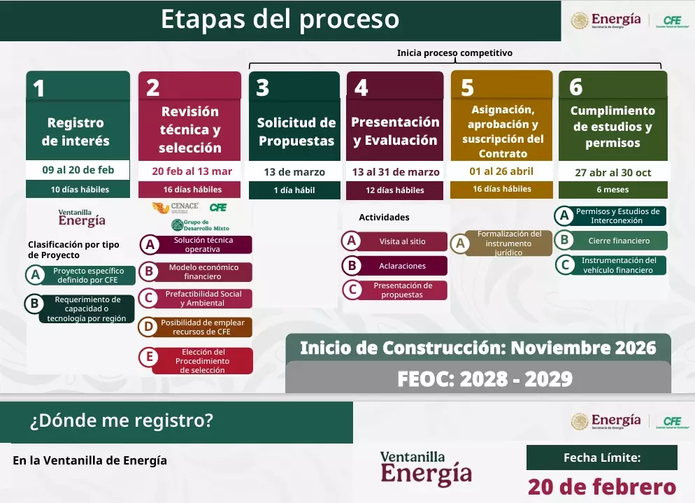 La Sener indicó que la fecha límite para registrar su interés en participar en el nuevo esquema es el 20 de febrero de 2026 mediante la Ventanilla de Energía que la dependencia ha puesto a disposición de los regulados del sector.