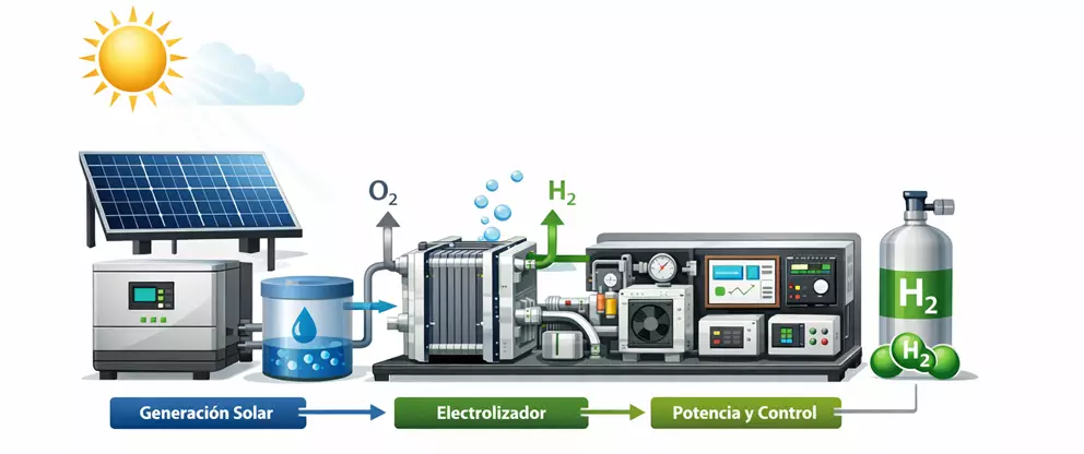Figura 3. Esquema de sistema de producción de hidrógeno renovable a partir de agua y energía solar fotovoltaica.