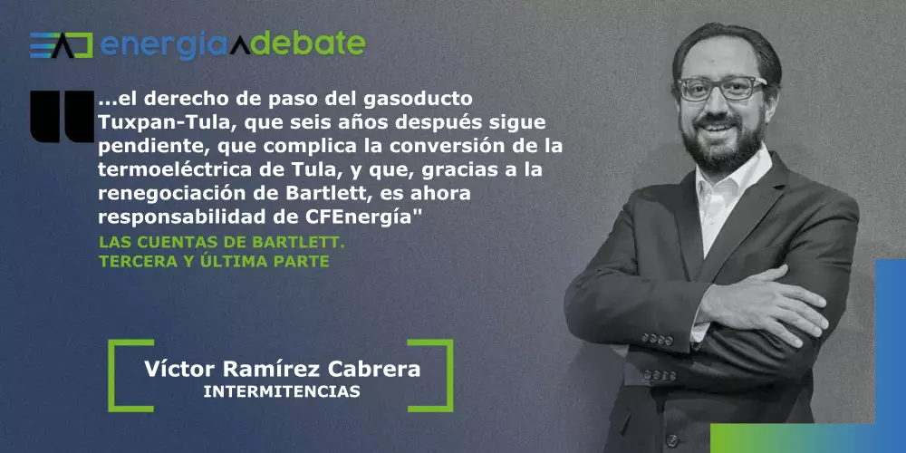 “…el derecho de paso del gasoducto Tuxpan-Tula, que seis años después sigue pendiente, que complica la conversión de la termoeléctrica de Tula y que, gracias a la renegociación de Bartlett, es ahora responsabilidad de CFEnergía”.