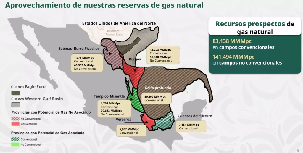 Al respecto, la funcionaria indicó que, en recursos prospectivos, México tiene 83 mil 138 billones de pies cúbicos en campos convencionales, pero 141 mil 494 billones en no convencionales.