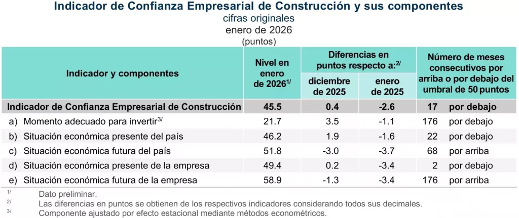 “El ICE de Construcción fue de 45.5 puntos en el mes de referencia: creció 0.4 puntos en su comparación mensual. Con este dato, el indicador se mantiene, por 17 meses consecutivos, por debajo del umbral de los 50 puntos”, señaló el organismo.