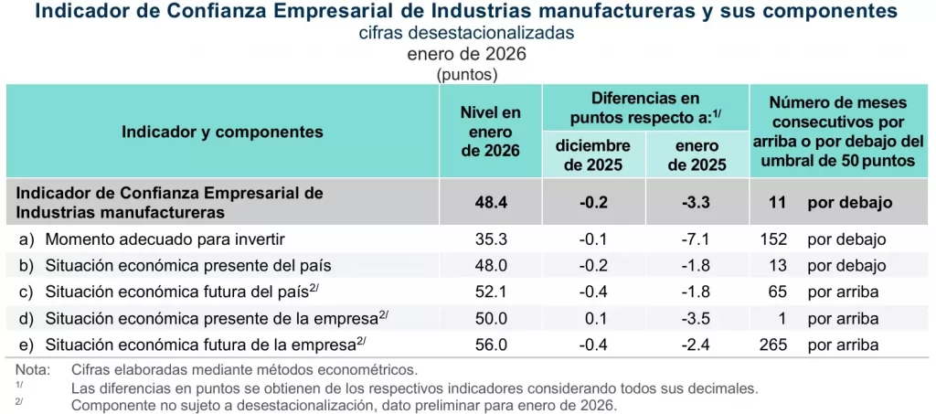 En enero pasado, el Indicador de Confianza Empresarial (ICE) de industrias manufactureras cayó 7.1 por ciento con respecto al mismo mes de 2025, esto referente a la percepción de si ese mes era momento adecuado para invertir.